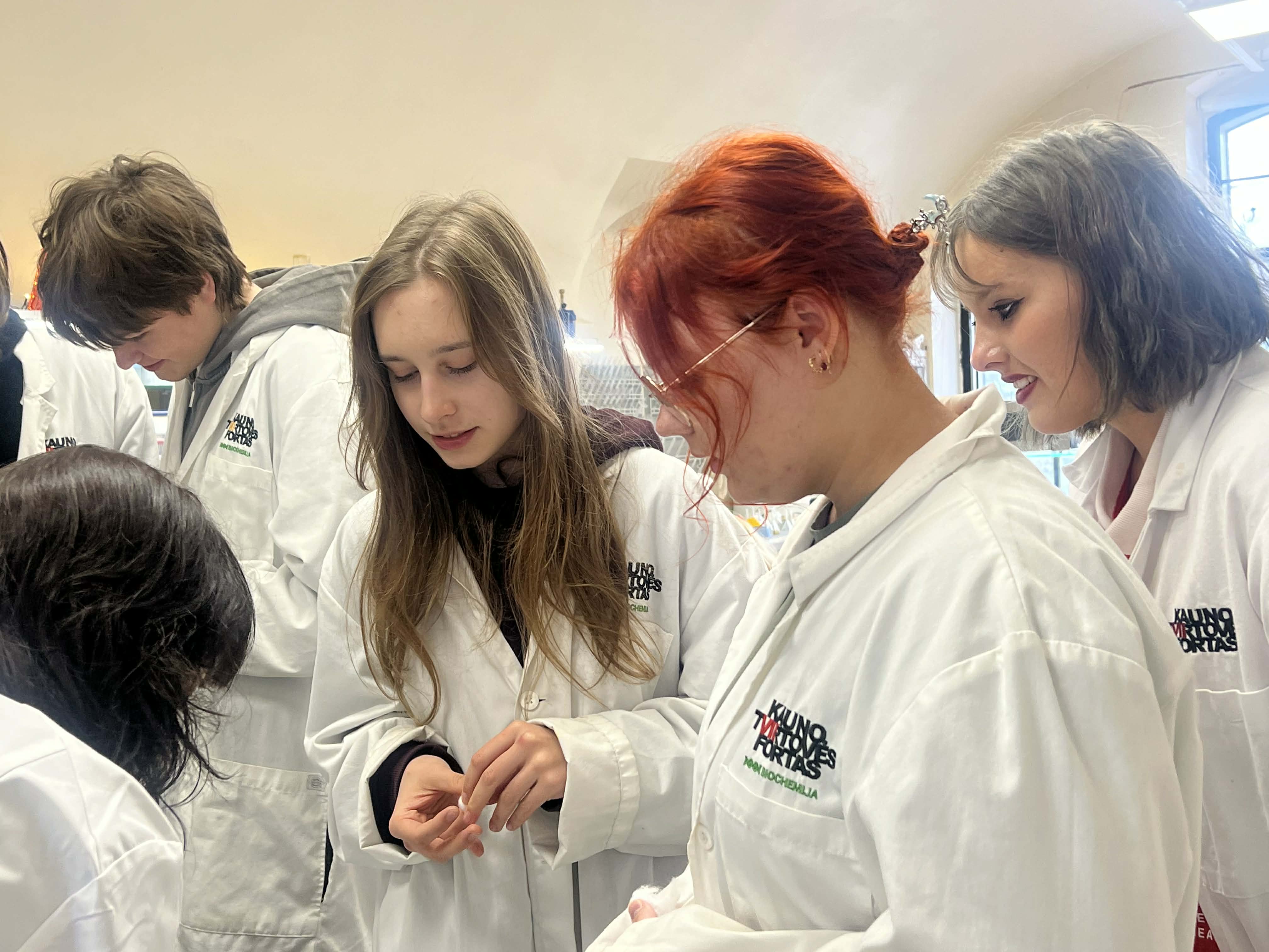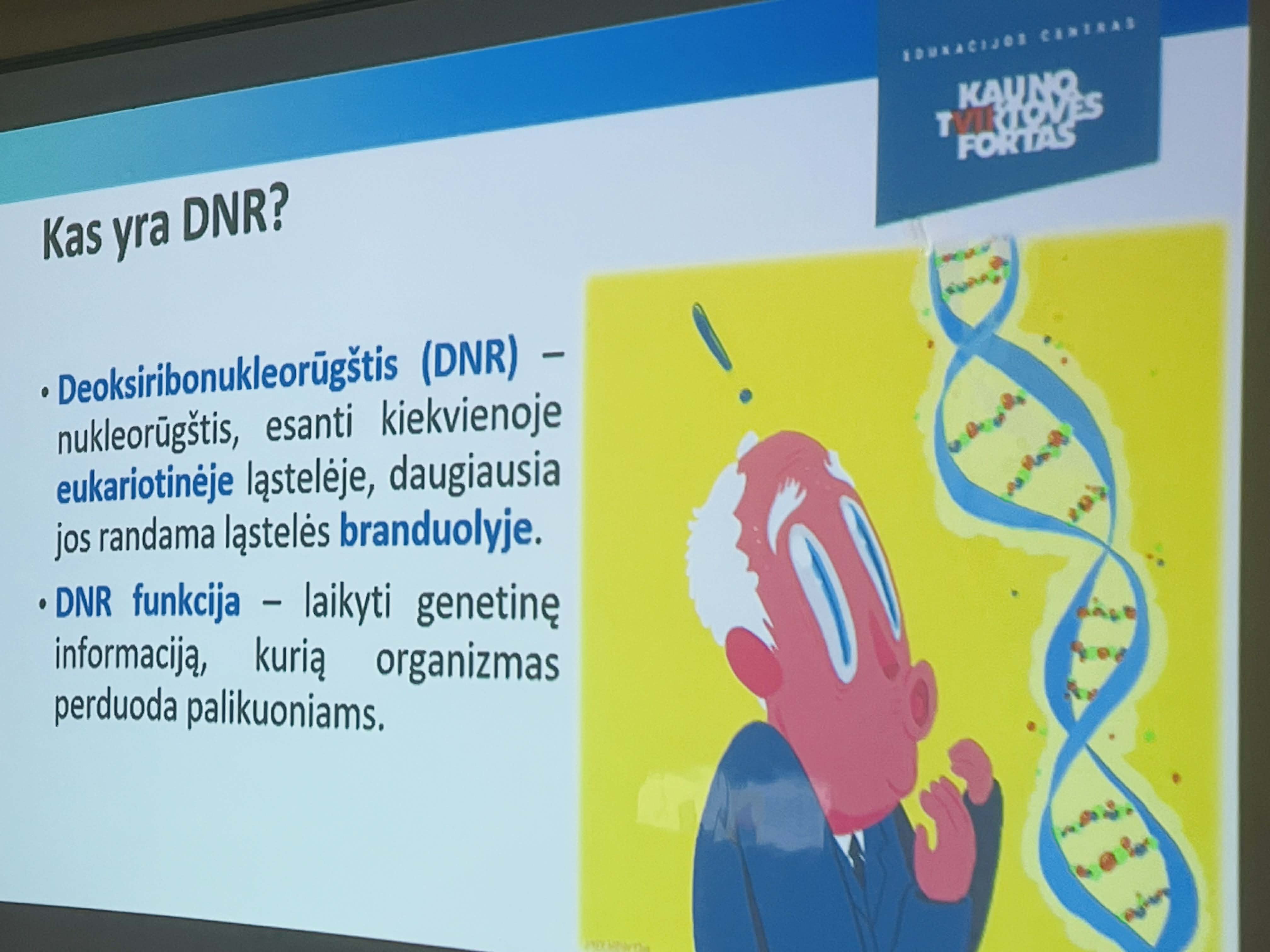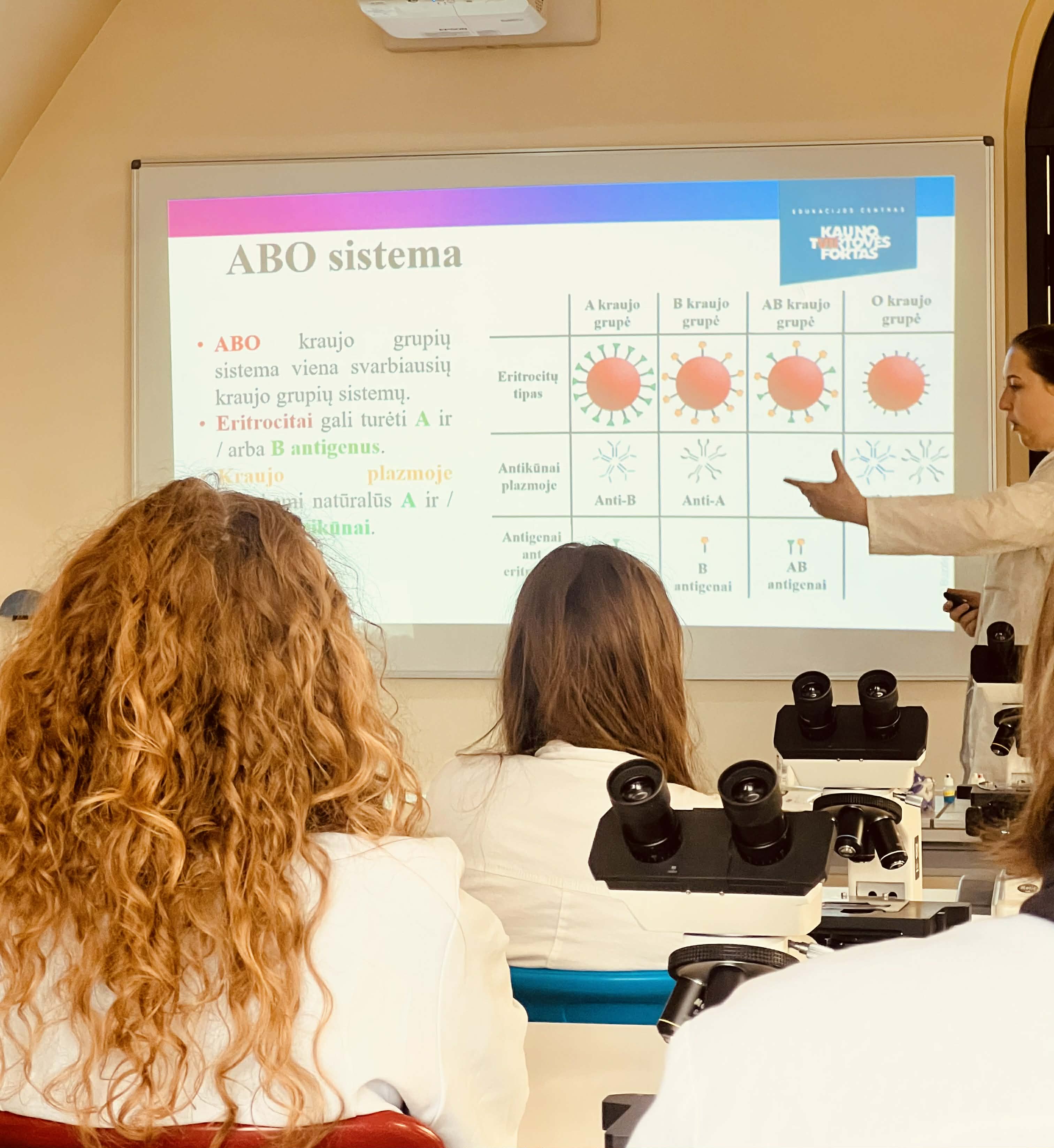 …..Mokiniai atliko kelis praktinius darbus: iš banano išskyrė DNR, aiškinosi šio proceso svarbą ir nustatė pagrindinius jo etapus. Antrojo praktinio darbo metu mikroskopu stebėjo kraujo tepinėlius. Mokiniai tyrinėjo skirtingas kraujo ląsteles, susipažino su žmogaus kraujo grupėmis, lygino įvairių stuburinių gyvūnų kraują. Išmokę kraujo grupių nustatymo metodiką ir panaudoję savo jungiamąjį audinį – kraują – jie atpažino savo kraujo grupes ir galėjo pro mikroskopą pamatyti savo paties organizmo ląsteles.