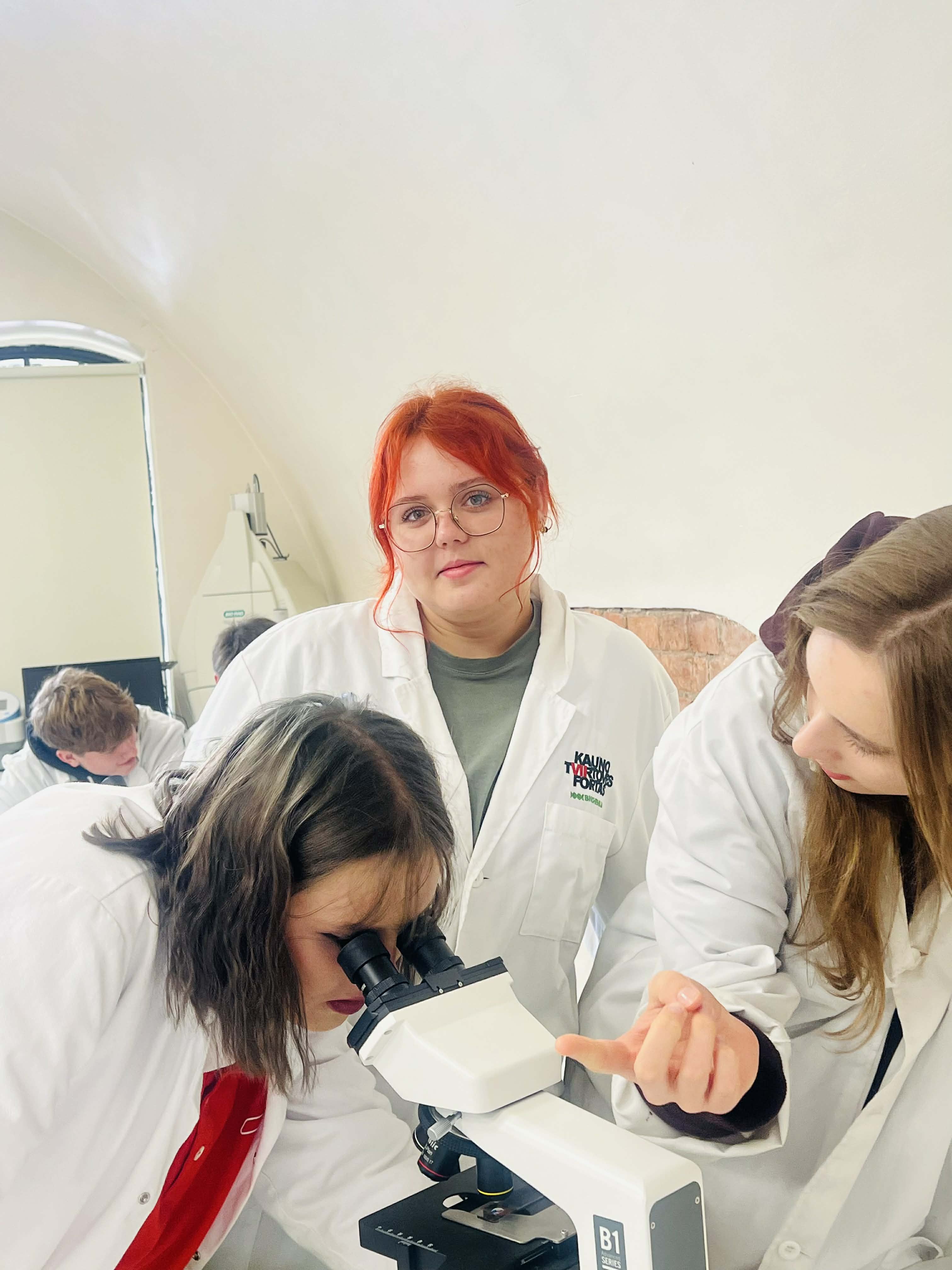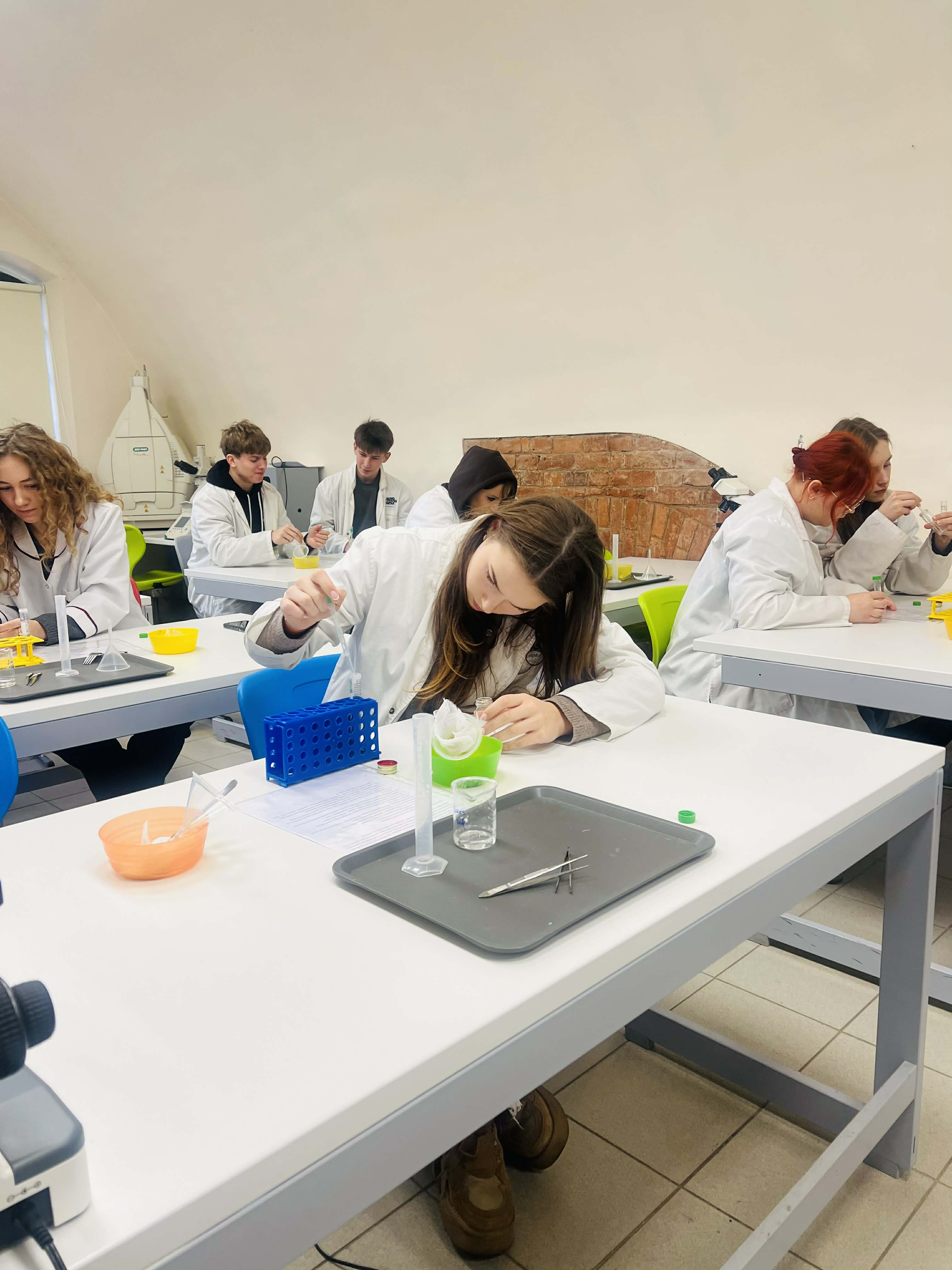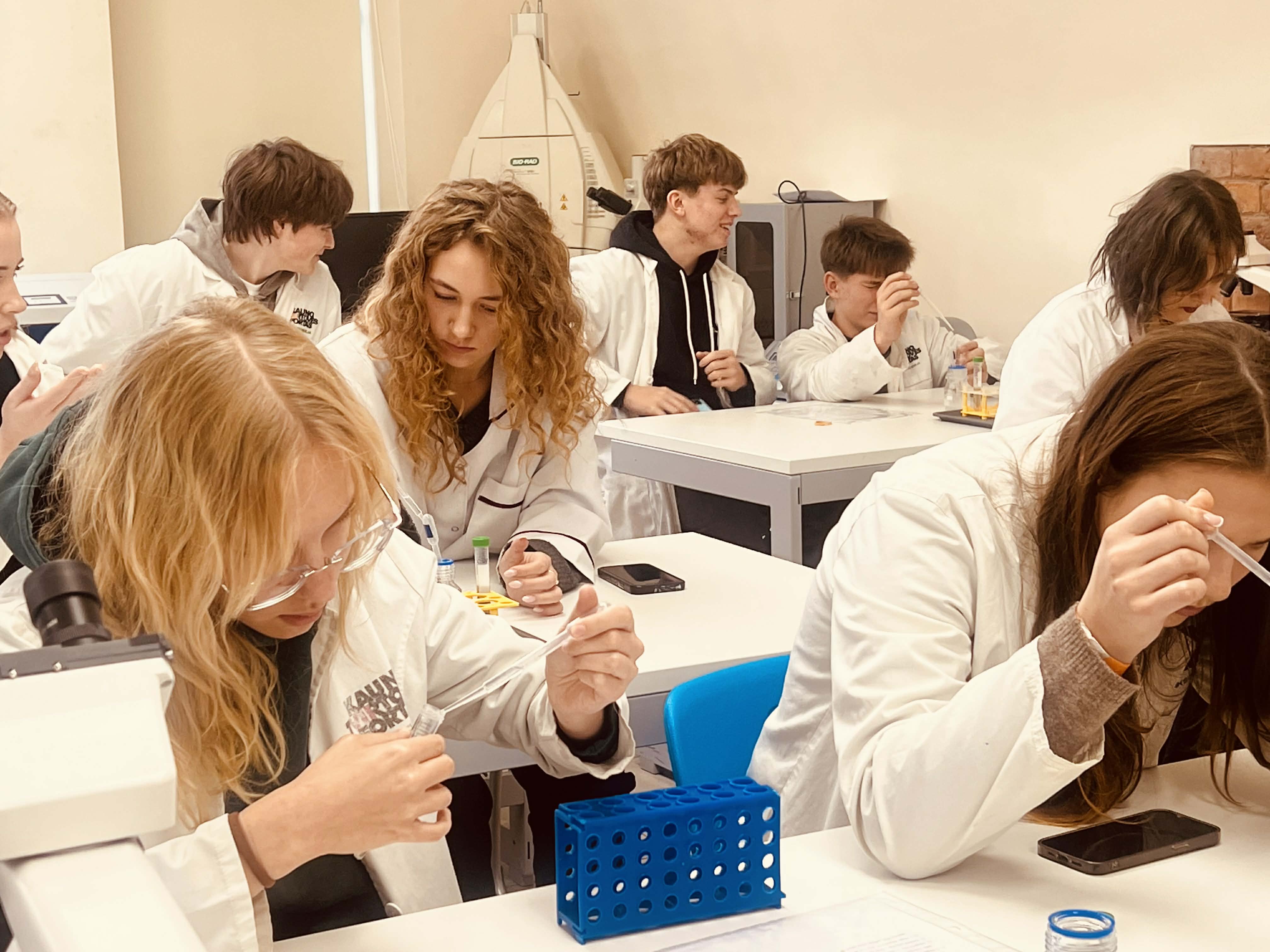 …..Mokiniai atliko kelis praktinius darbus: iš banano išskyrė DNR, aiškinosi šio proceso svarbą ir nustatė pagrindinius jo etapus. Antrojo praktinio darbo metu mikroskopu stebėjo kraujo tepinėlius. Mokiniai tyrinėjo skirtingas kraujo ląsteles, susipažino su žmogaus kraujo grupėmis, lygino įvairių stuburinių gyvūnų kraują. Išmokę kraujo grupių nustatymo metodiką ir panaudoję savo jungiamąjį audinį – kraują – jie atpažino savo kraujo grupes ir galėjo pro mikroskopą pamatyti savo paties organizmo ląsteles.