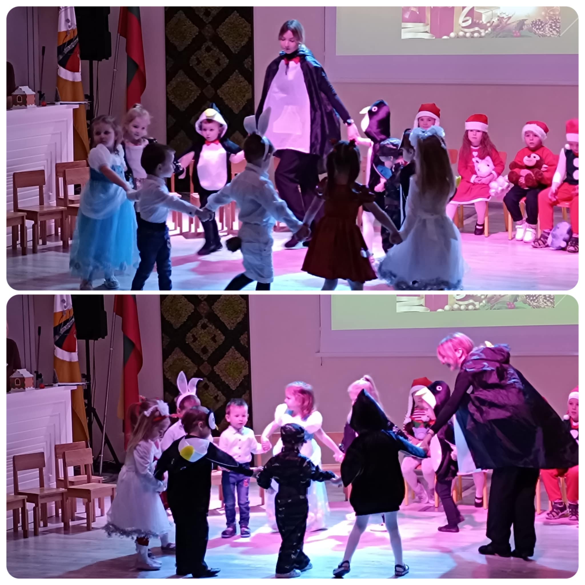 …..Kalėdinė pasaka prasidėjo… Skambant švelniai melodijai, salėje suspindo kalėdinė eglutė. Mažieji gimnazistai linksmai ir džiaugsmingai pradėjo savo šventinį pasirodymą. Scenoje pasirodė išdykėliai nykštukai, jie labai laukė Kalėdų Senelio, todėl linksmai deklamavo, dainavo ir žaidė. Tačiau Kalėdų Senelis užtruko kelionėje, o prie eglutės jau krypavo stebuklingi pingvinai. Jie pakvietė vaikus linksmai pašokti ir tapti tikrais Šiaurės ašigalio gyventojais. …..Smagiai sukdamiesi šokio sūkuryje ir dainuodami daineles, mažieji šventės dalyviai net nepastebėjo, kaip prie gimnazijos durų sustojo baltos rogės. Į salę linksmai žengė linksmoji Elfė. Mažieji artistai nuščiuvo, prasidėjo tikrosios Kalėdų linksmybės! Elfė pakvietė vaikus dalyvauti šventinėje diskotekoje, mokė žaisti linksmus žaidimus, pasakojo, kaip nykštukai gamina dovanėles, kaip Senelis keliauja pas vaikus, visi drauge mokėsi kalėdinių burtų ir šokių. O visai netrukus mažųjų laukė labiausiai džiuginantis šventės momentas. Visi šventės dalyviai išgirdo garsų Kalėdų Senelio balsą, sklindantį iš už durų. Buvo smagu matyti besišypsančius mažųjų ugdytinių veidus ir džiugesio kupinas akeles. Susitikimas su Kalėdų Seneliu buvo tarsi stebuklas. Po linksmos ir nuotaikingos programos, Kalėdų Senelis įteikė vaikučiams jų svajonių dovanas.