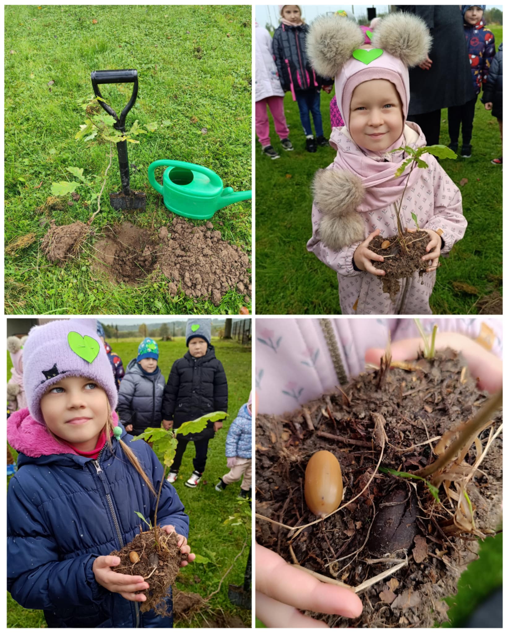 …..Mažieji gamtos mylėtojai, lydimi savo mokytojų, išsiruošė į kiemą, kur jų laukė iš anksto paruošta vieta. Vaikai, ,,apsiginklavę” mažais kastuvėliais, noriai dalyvavo sodinimo procese. Kartu su suaugusiaisiais pasodino ąžuolo medelius, pamatė, kaip atrodo šaknys ir kaip atsargiai reikia elgtis su jaunais augalais.