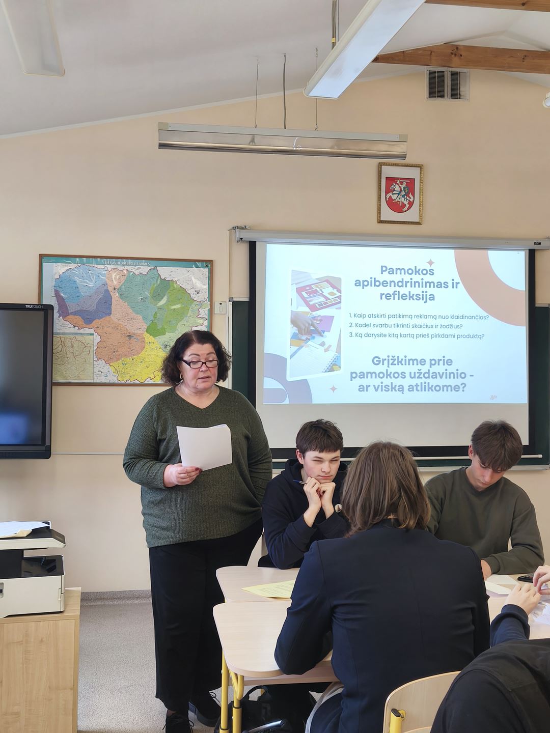 …..Svarbi pamokos dalis buvo atliktų užduočių pristatymas ir refleksija. Kiekviena grupė parengė savo darbo pristatymą: mokiniai pateikė išvadas apie analizuotas reklamas, argumentavo, kokiais kalbiniais ir matematiniais įrodymais rėmėsi, lygino pasirinktas strategijas. Diskutuodami jie aptarė, kas padėjo tiksliau atskleisti reklamos patikimumą, o kur susidūrė su iššūkiais. Refleksijos metu mokiniai įsivertino savo indėlį į grupinį darbą, pasidalijo įžvalgomis apie reklamos kūrimo principus, atpažintas gudrybes ir tai, kaip tokios veiklos padeda priimti atsakingesnius sprendimus kasdieniame gyvenime.