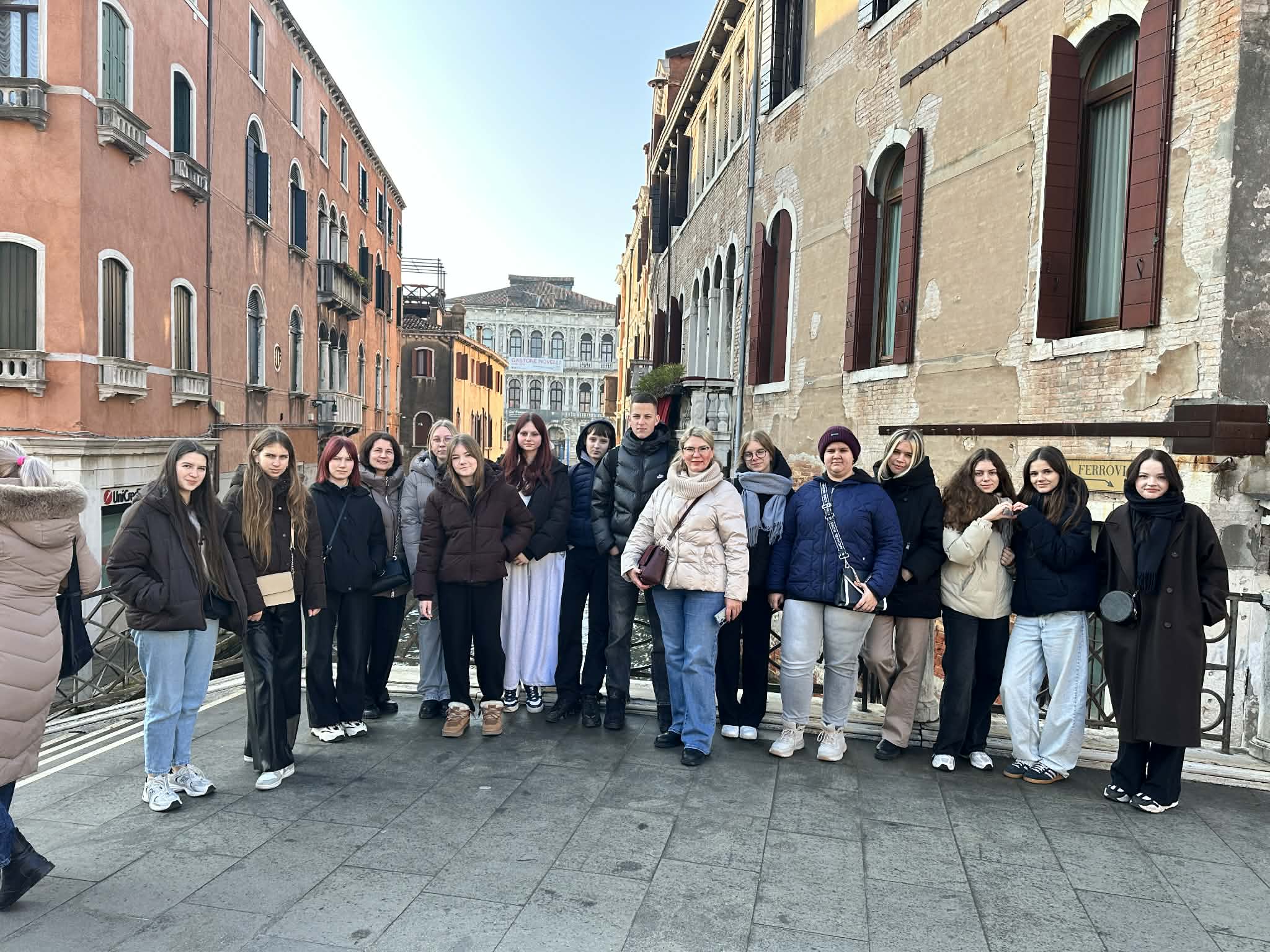 …..Žiemai tik prasidėjus mūsų gimnazijos mokinių grupė kartu su lydinčiomis mokytojomis leidosi į įsimintiną edukacinę kelionę į Italiją. Atvykę į Treviso oro uostą, iškart pajutome artėjančią itališką dvasią. Kelionę tęsėme į Mestre – miestą žemyninėje Venecijos dalyje, kuriame apsistojome visai šalia pagrindinių lankytinų vietų.