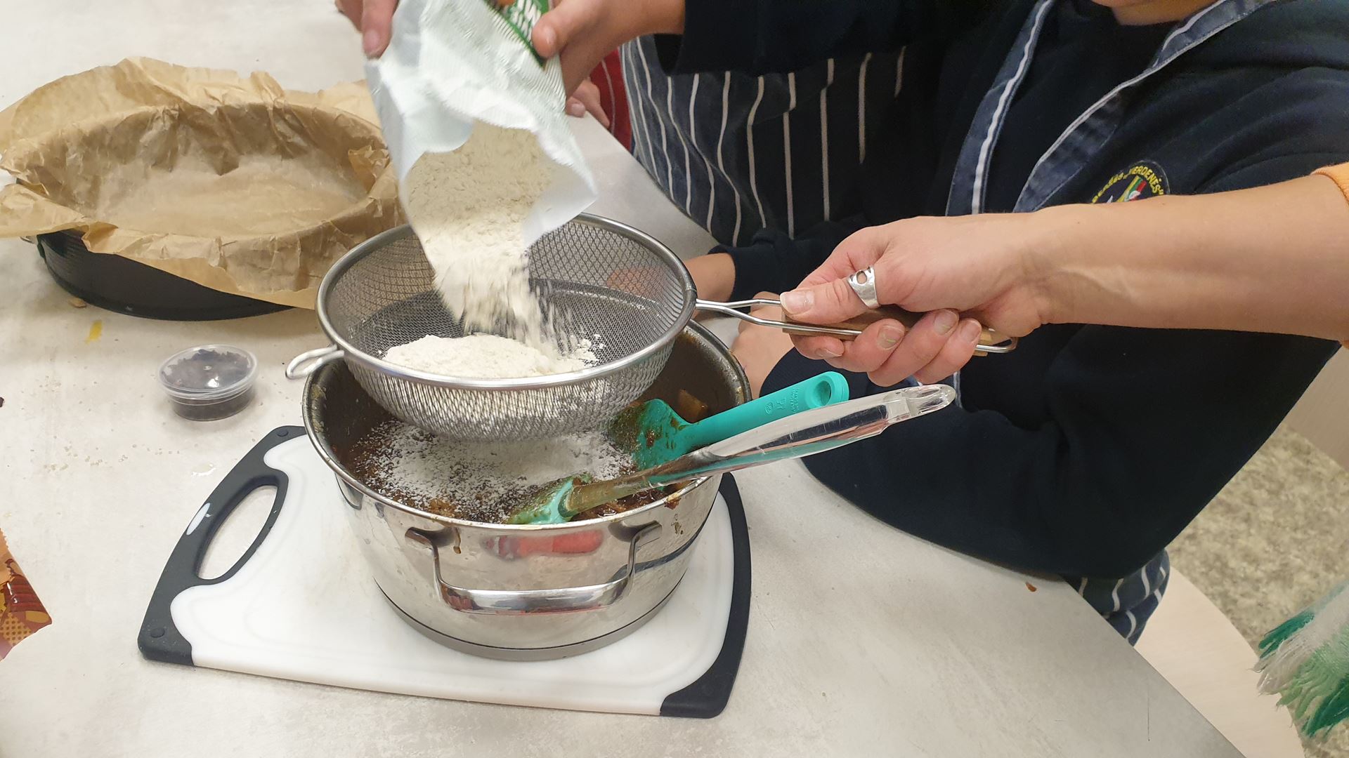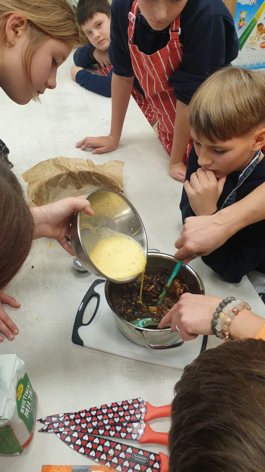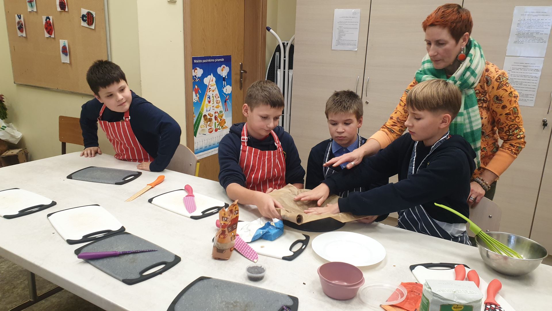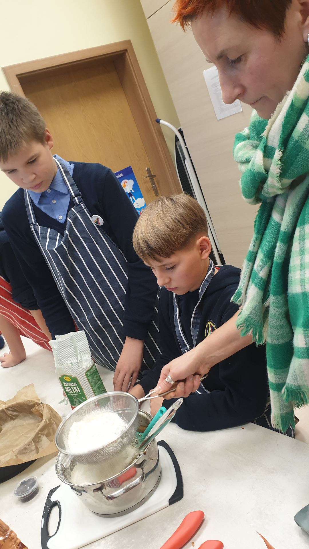 …..Kiekvienas mokinys turėjo savo užduotį: vieni pjaustė džiovintus vaisius, kiti maišė tešlą, dar kiti plakė kiaušinius. Visi dirbo draugiškai, bendradarbiavo ir padėjo vieni kitiems. Pašovus pyragą į orkaitę, pamoka toliau tęsėsi jaukioje aplinkoje – visi kartu dainavome kalėdines dainas.