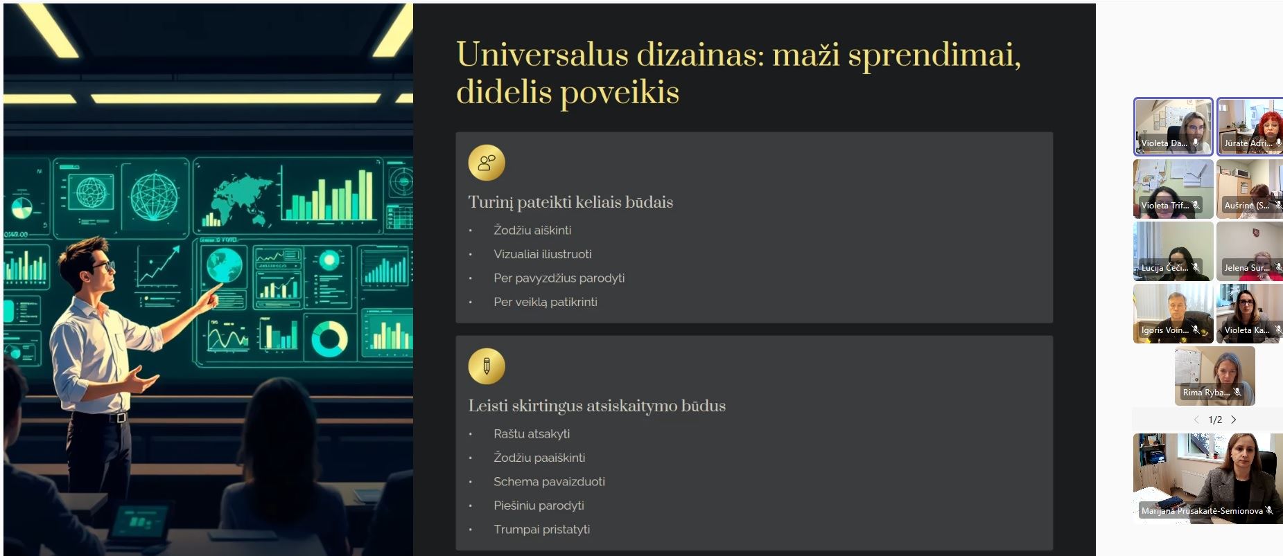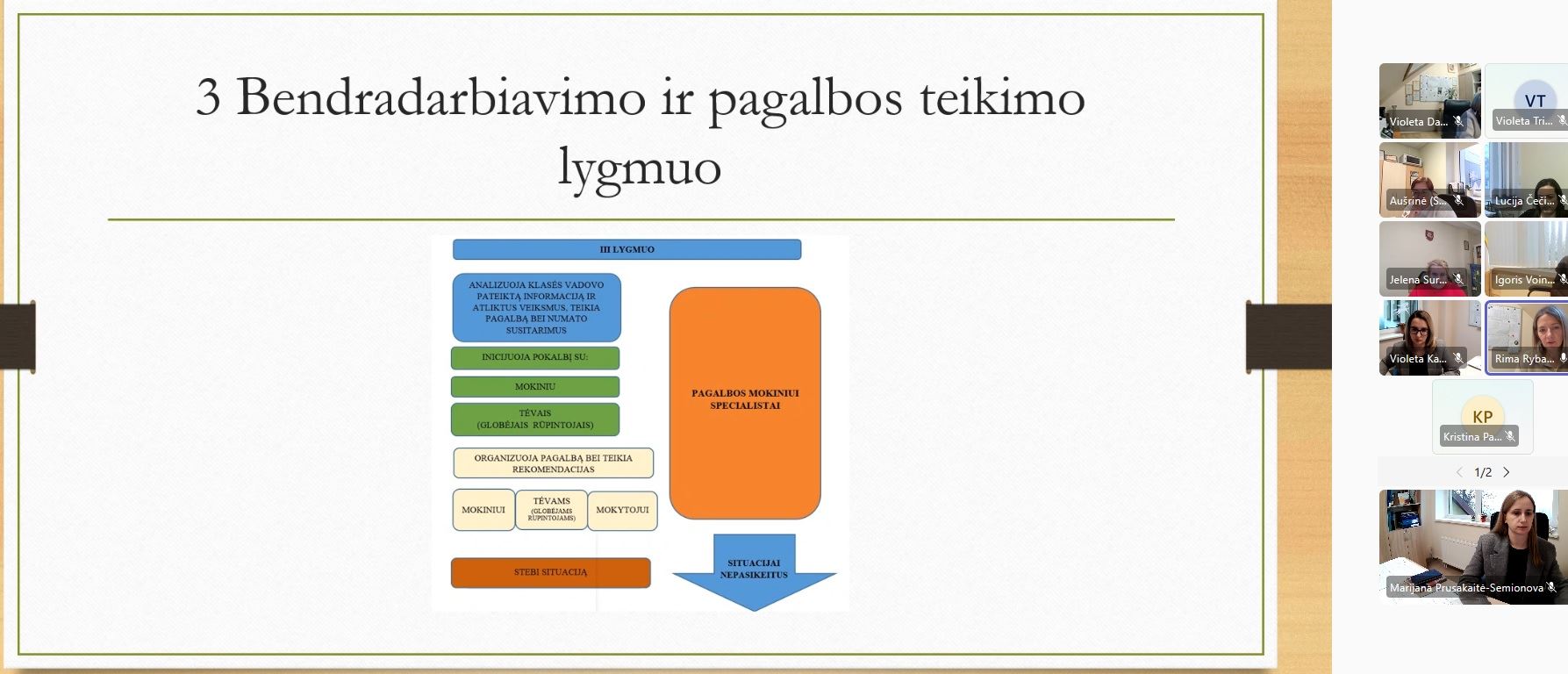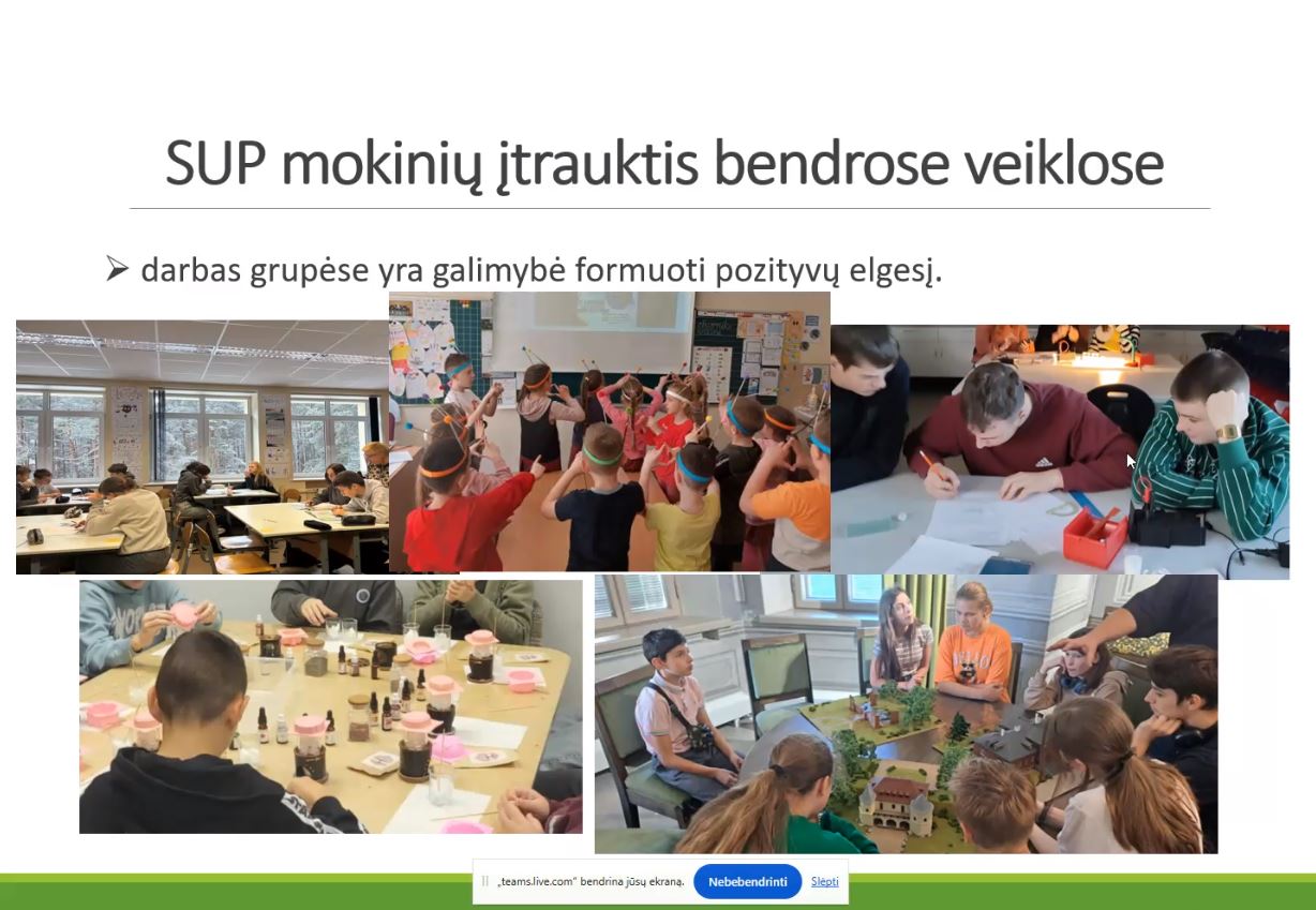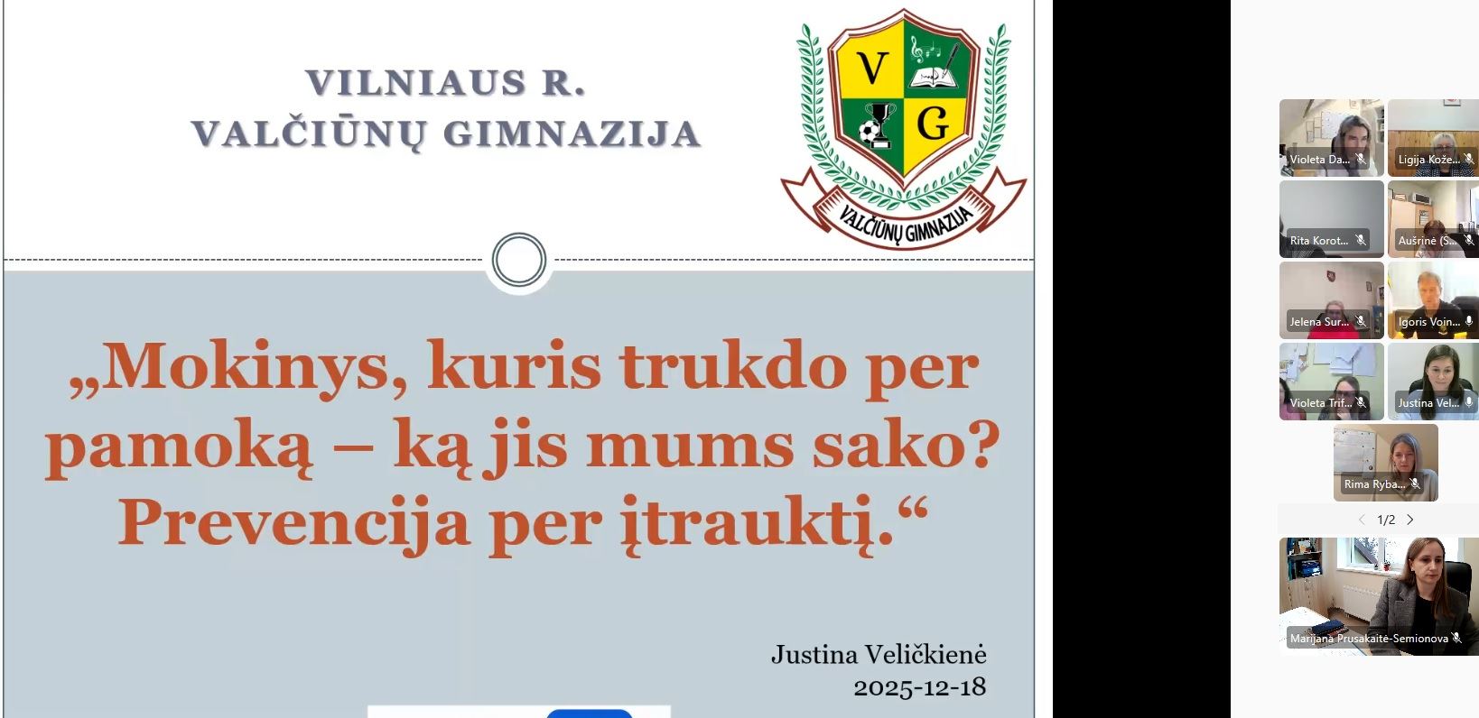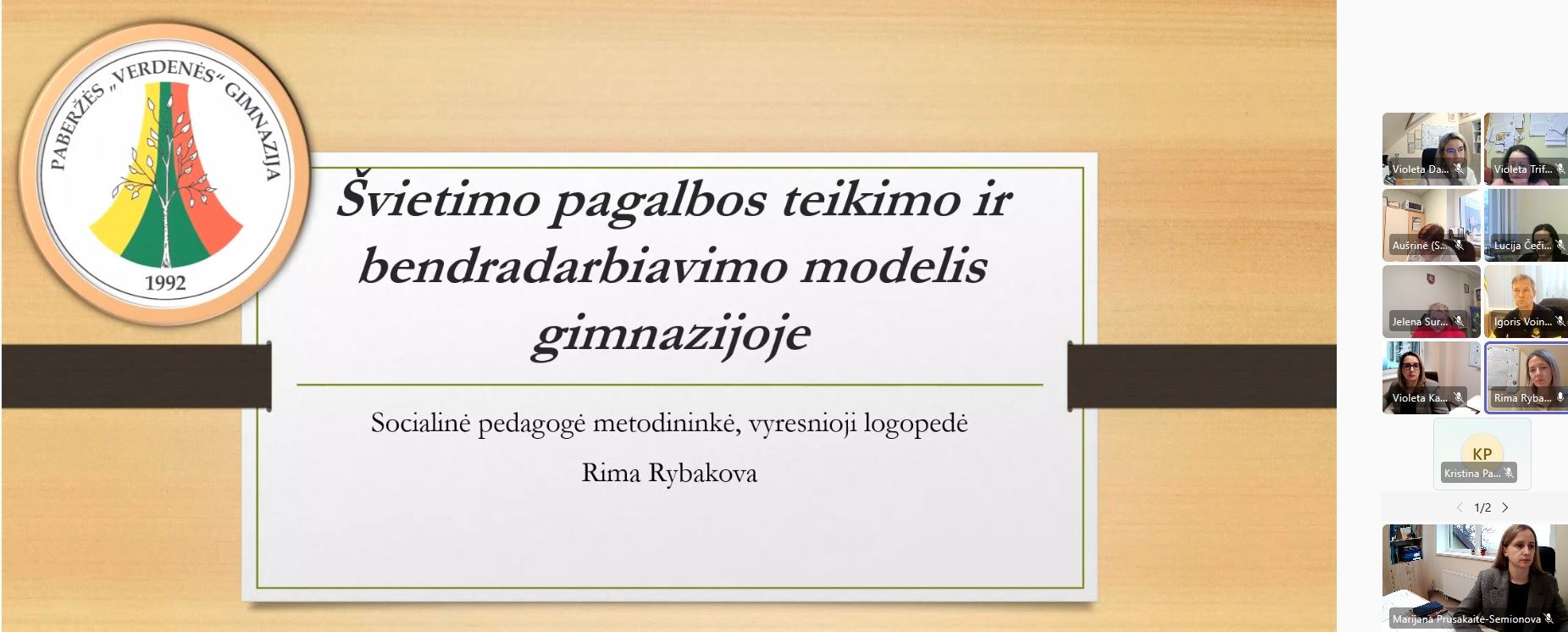 …..Gruodžio 18 dieną vyko nuotolinė gerosios patirties sklaidos sesija, subūrusi vadovus, pedagogus ir švietimo pagalbos specialistus iš bendradarbiaujančių mokyklų. Susitikimo metu dalyviai pristatė savo gimnazijų patirtis: aptarė įtraukiojo ugdymo organizavimą, skirtingų gebėjimų mokinių įtrauktį į bendras veiklas, pozityvaus elgesio formavimo praktikas, universalaus dizaino taikymą pamokose, bendradarbiavimo modelius.