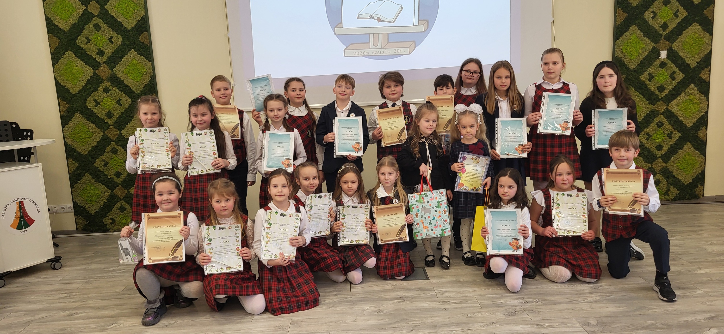 …..Priešmokyklinio ugdymo grupės skaitovė Luknė Meško pasirodė puikiai. Pirmos-antros klasių grupėje geriausiai pasirodė antrokas Oskaras Nevėra, o trečių-ketvirtų klasių grupėje – trečiokas Domas Jarumbauskas. Visi šie mokiniai vyks atstovauti gimnazijai rajoniniame raiškiojo skaitymo konkurse.