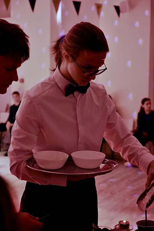 …..Vienuoliktokai, pasiskirstę vaidmenimis, tapo padavėjais, šokėjais, apsaugos darbuotojais bei restorano administratoriais. Abiturientai buvo sutikti kaip garbingi svečiai – su šypsenomis, dėmesiu ir ypatingu dienos meniu. Jiems buvo pristatyta speciali programa, simboliškai pavadinta dienos meniu, kuri atspindėjo mokyklinio gyvenimo etapus ir artėjančius brandos egzaminus.