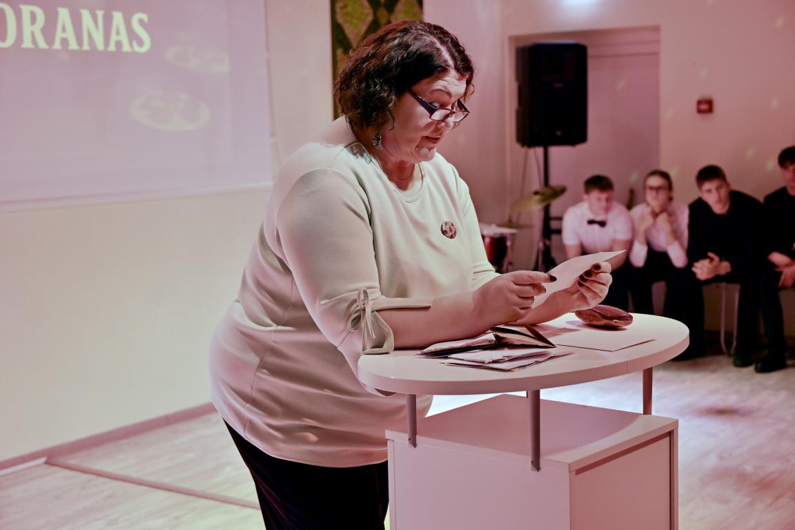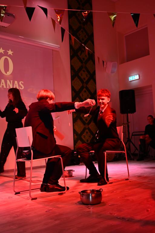 …..Renginio metu netrūko humoro, staigmenų ir linksmų užduočių. Skambėjo muzika, vyko šokio ir meniniai pasirodymai, improvizuoti dialogai. Šventę dar labiau praturtino sveikinimo kalbos. Dvyliktokus šiltai sveikino gimnazijos direktorė Violeta Dapkevičienė, linkėdama sėkmės paskutiniame mokyklos etape, gražių prisiminimų ir drąsos siekti savo tikslų. Nuoširdžius žodžius tarė ir klasės vadovė Marijana Prusakaitė-Semionova, prisiminusi bendrus metus, iššūkius bei pasiektus laimėjimus. Šventėje dalyvavusios pirmosios mokytojos bei tėveliai taip pat sveikino abiturientus, linkėjo jiems pasitikėjimo savimi ir sėkmingo kelio į ateitį.