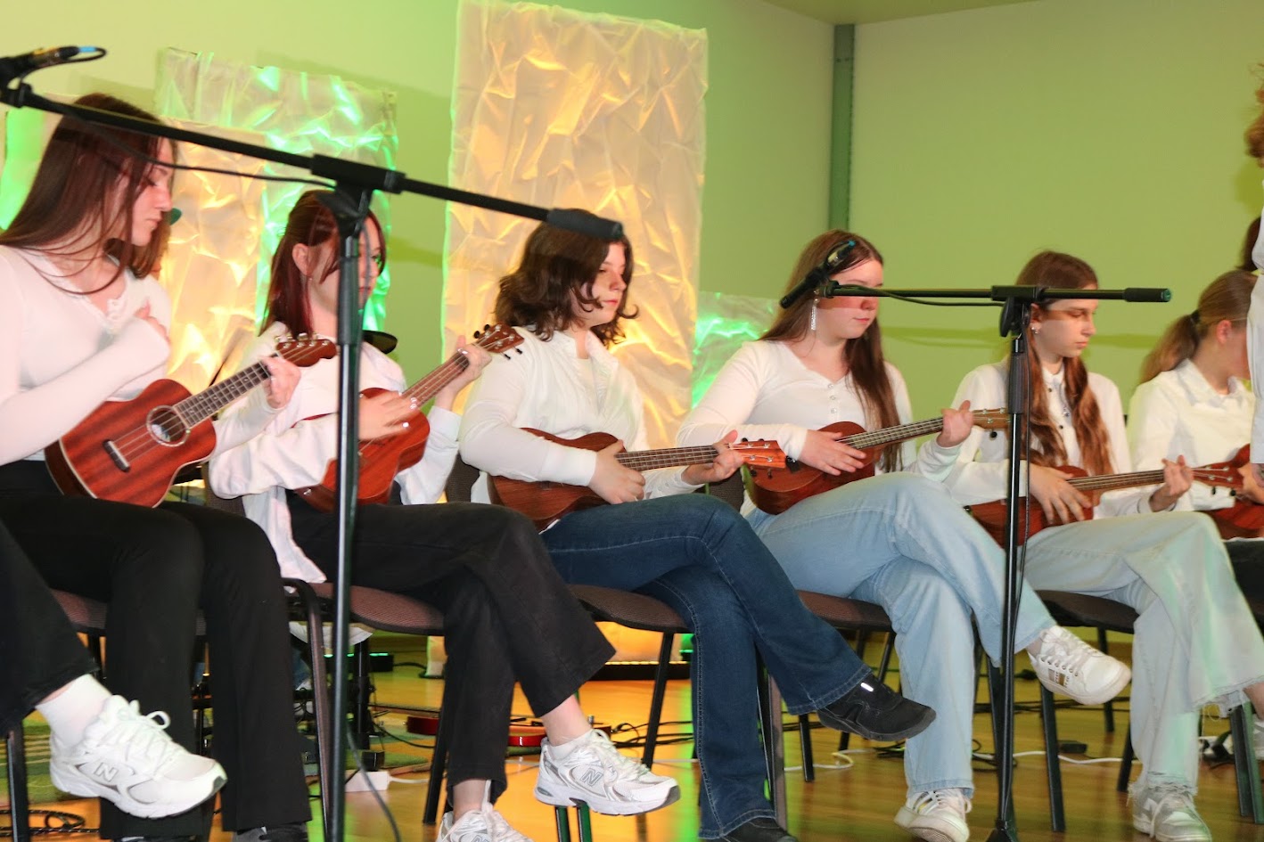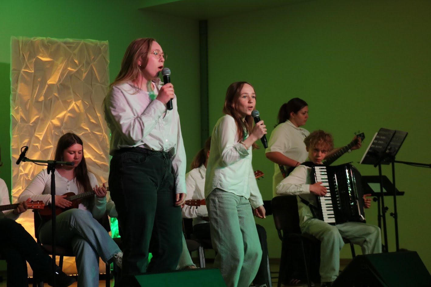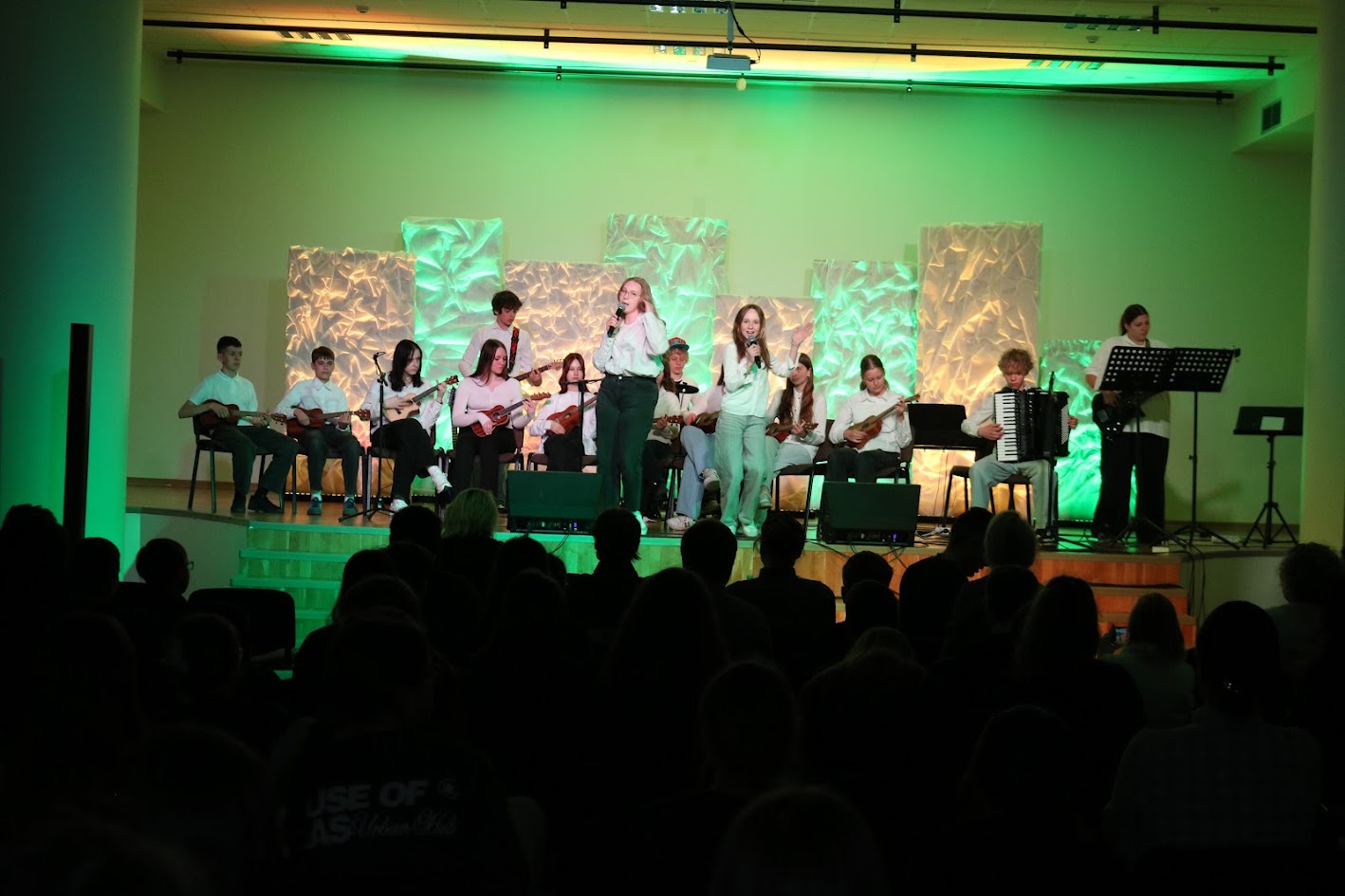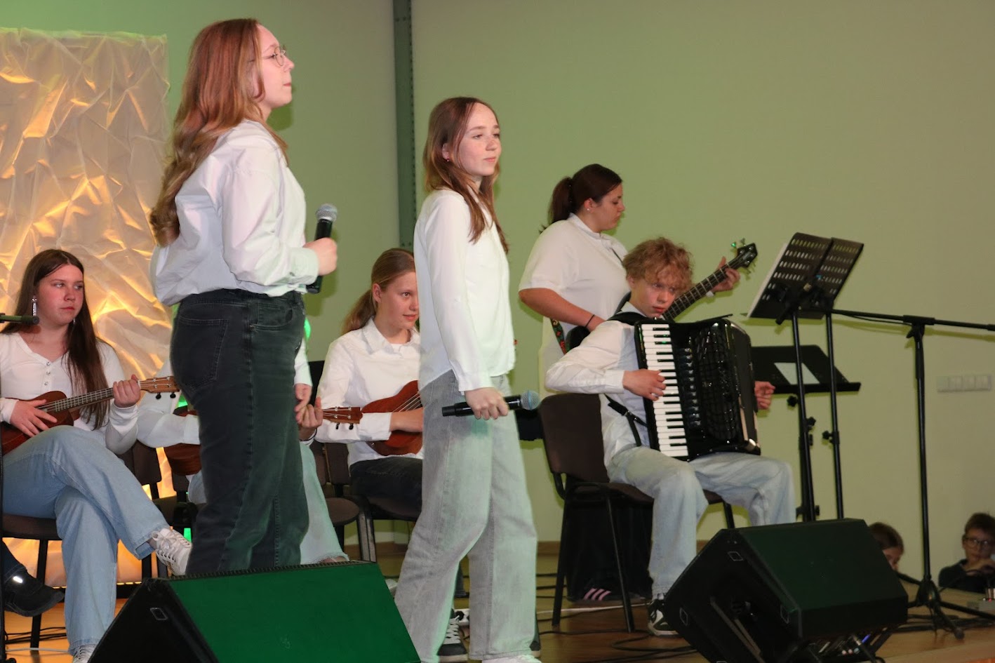 …..Festivalio scenoje jaunieji muzikantai pristatė gyvą ir jaunatvišką A. Mamontovo dainos „Vaikystės stogas“ interpretaciją. Pasirodymą dar labiau praturtino prie grupės prisijungęs ukulelių ansamblis – iš viso scenoje susibūrė net 15 kūrybingų atlikėjų, sukūrusių šiltą, pavasarišku skambesiu alsuojančią muzikinę atmosferą.